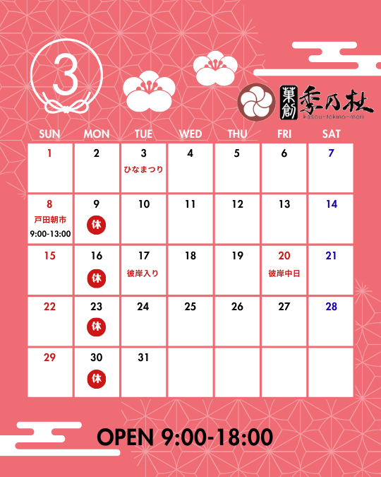 お知らせ ☆3月のお知らせ☆ 2026年2月26日 tokinomoriuser 3月3日(火)ひなまつり 3月8日(日)戸田朝市出店 3月17日(火)彼岸入り お節句やお彼岸、卒園・卒業、異動などの際には 地元戸田の和菓子店をぜひご利用ください。 ご予約・取り置き、お気軽にお申しつけください。